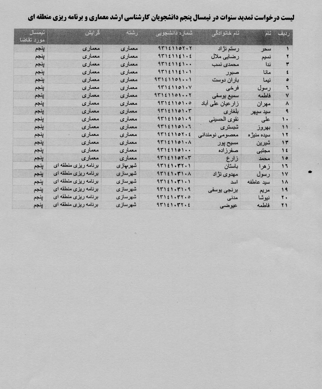 4- لیست دانشجویانی که با تمدید سنوات پنجم(نیمسال اول 96-95 )آنها در جلسه 95/7/6 شورای تحصیلات تکمیلی دانشکده موافقت شده است.(لطفاً حداکثر تا تاریخ 95/8/1 جهت اخذ این واحد درسی به اموزش مراجعه فرمایید)