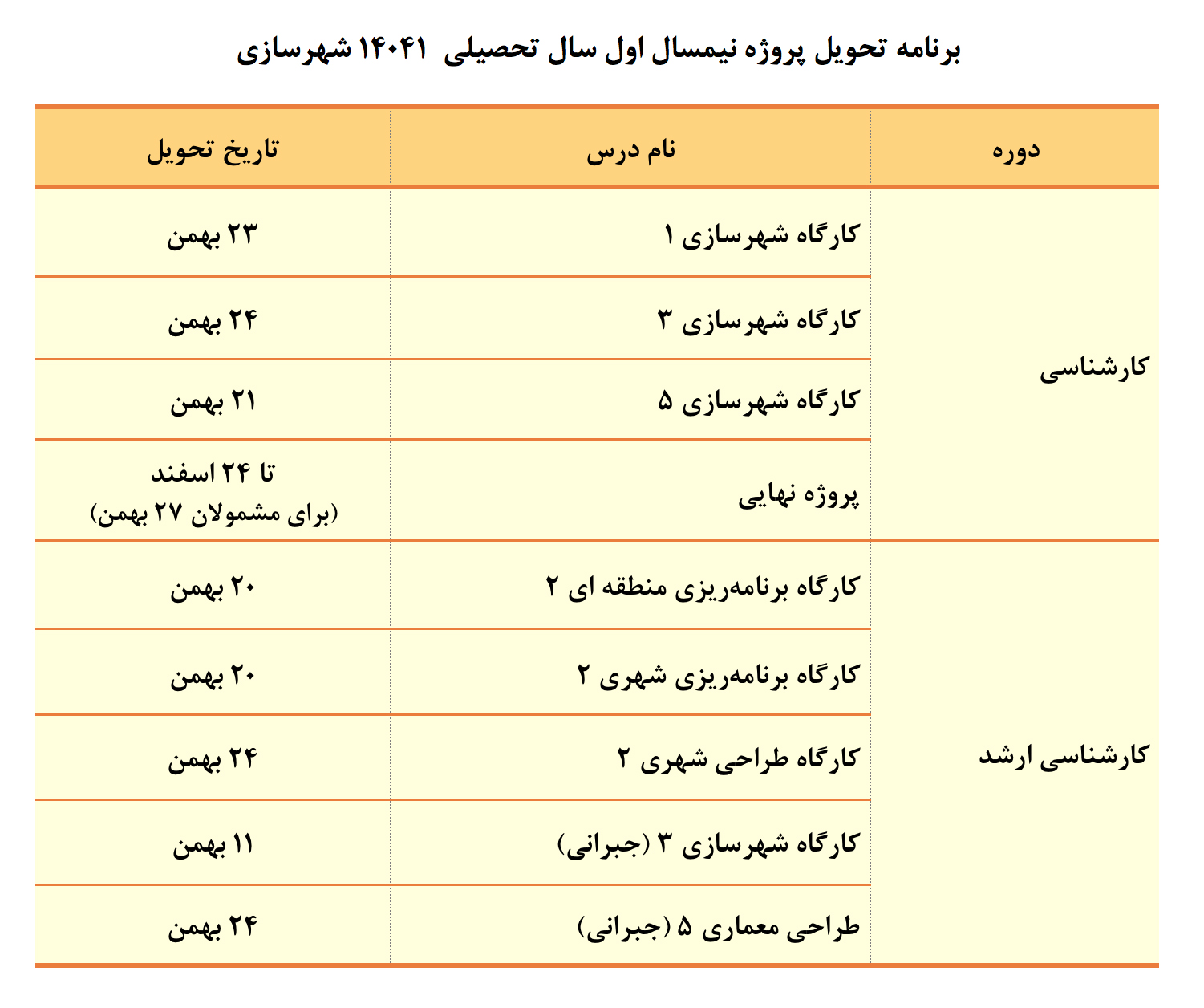 به اطلاع دانشجویان گرامی رشته‌ شهرسازی می‌رساند، زمان‌بندی  تحویل پروژه‌های دروس عملی مطابق جدول پیوست خواهد بود.