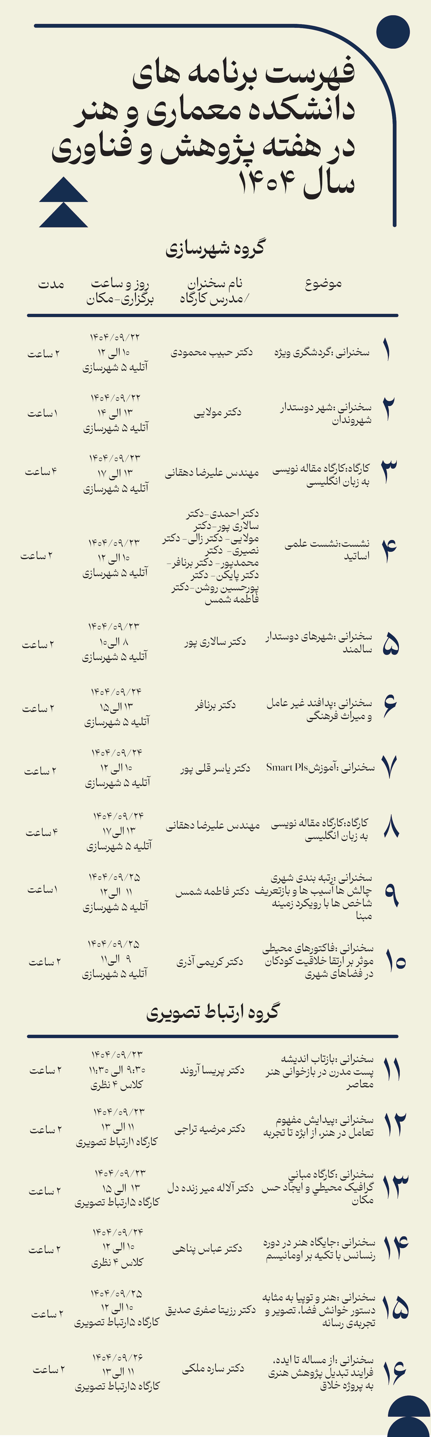 ضمن گرامیداشت هفته پژوهش و فناوری، به اطلاع میرساند دانشکده معماری و هنر به همین مناسبت، مجموعهای از برنامههای علمی و پژوهشی را برگزار مینماید.جزئیات و زمانبندی برگزاری برنامهها در تصویر پیوست قابل مشاهدهاست. از کلیه اعضای هیأت علمی، پژوهشگران، دانشجویان و علاقهمندان دعوت میشود با حضور فعال در این برنامهها، در گسترش تعاملات علمی و تقویت فضای پژوهشی دانشکده مشارکت نمایند.