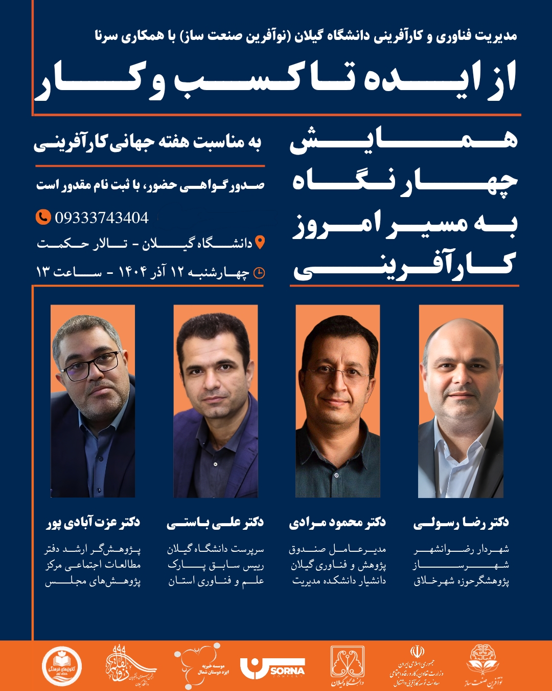 اولین نشست تخصصی در خصوص شناسایی و رفع نیازهای صنایع در حوزه توسعه فناوری، انتقال دانش فنی و تجاری‌سازی دستاوردهای پژوهشی، در مرکز نوآوری دانشگاه گیلان برگزار شد. در این رویداد، نمایندگان بیش از ۲۰ شرکت و واحد صنعتی استان حضور داشتند و مهم‌ترین چالش‌ها، نیازهای فناورانه و فرصت‌های همکاری مشترک میان صنعت و دانشگاه مورد بحث و بررسی قرار گرفت و هدف اصلی این نشست، ایجاد بستر تعامل مؤثر میان صنایع و ظرفیت‌های علمی، پژوهشی و فناورانه دانشگاه گیلان، کمک به رفع نیازهای فناورانه واحدهای صنعتی، تسهیل فرآیند انتقال فناوری و حمایت از تجاری‌سازی ایده‌ها و طرح‌های فناورانه بود. در ادامه نشست، شرکت‌های حاضر به بیان مسائل، نیازها و اولویت‌های فناورانه خود پرداخته و زمینه‌های همکاری مشترک در قالب پروژه‌های تحقیق و توسعه، قراردادهای فناورانه و استقرار واحدهای تحقیق و توسعه مورد بررسی قرار گرفت و ظرفیت‌های مرکز نوآوری دانشگاه گیلان در حمایت از شرکت‌های فناور، تیم‌های نوآور و ایده‌های صنعتی معرفی شد.