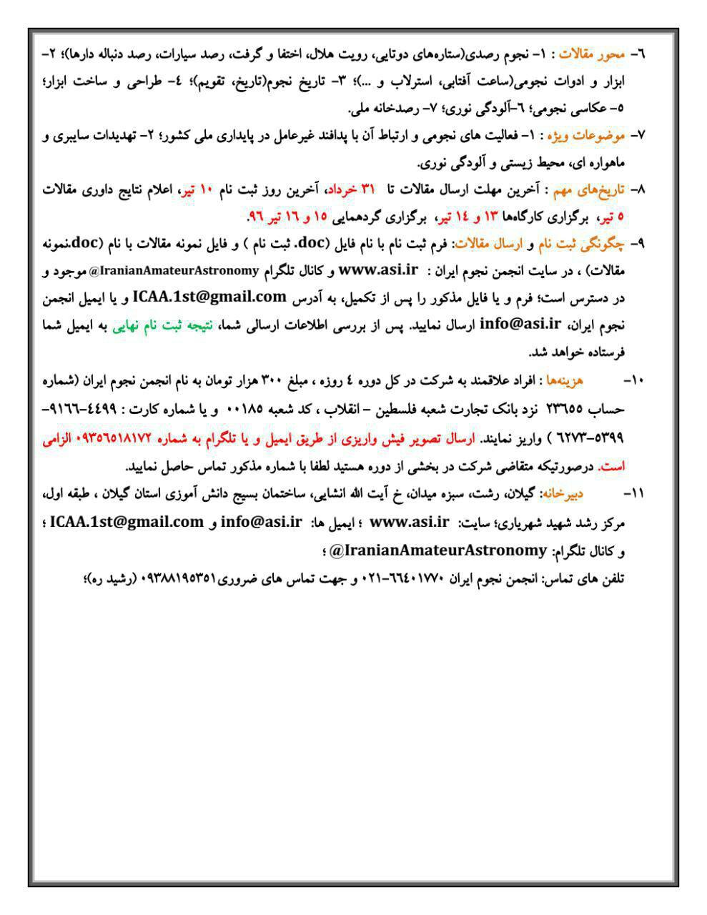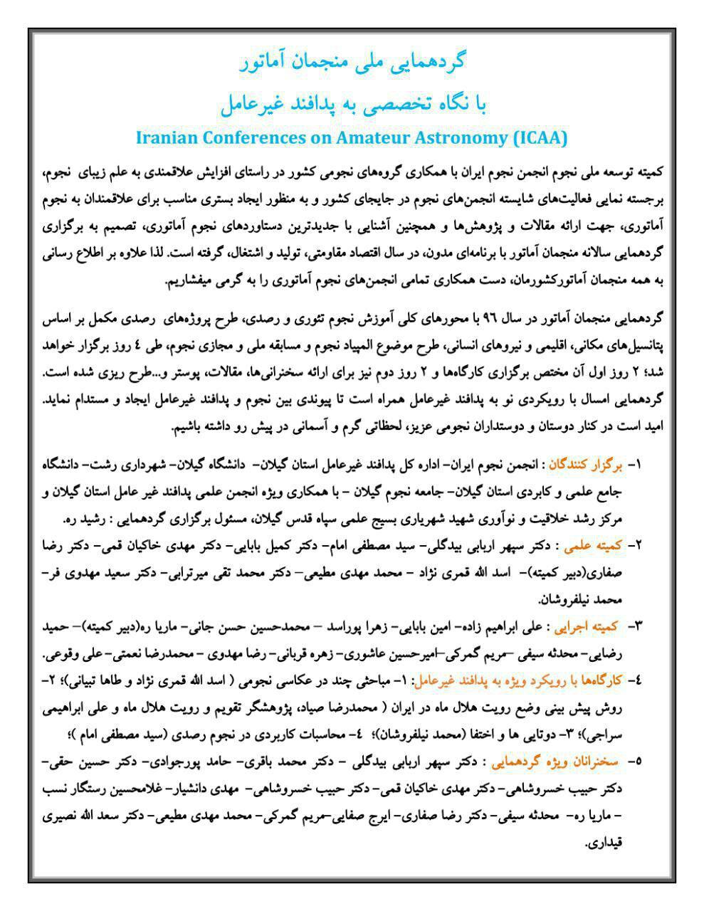 "گردهمایی ملی منجمان آماتور در سال 1396 با نگاه تخصصی به پدافند غیرعامل" با همکاری دانشگاه گیلان از تاریخ 13 الی 16 تیرماه در استان گیلان برگزار می شود. به اطلاع کلیه دانشجویان  و دانش آموزان استان گیلان می رساند، امتیاز برگزاری برنامه امسال طی ۴ روز از طرف انجمن نجوم ایران به جامعه نجوم گیلان واگذار شده و برنامه مذکور با یاری دانشگاه گیلان، پدافند غیرعامل استان و شهرداری رشت برگزار خواهد شد. لذا این امکان حاصل شده تا دانشجویان و اعضای هیات علمی علاقه مند کلیه رشته های دانشگاه گیلان (به صورت رایگان و با تقبل هزینه های مرتبط از سوی دانشگاه) در هر ۴ روز برنامه مذکور حضور داشته باشند و از سخنرانی دانشمندان و فرهیختگان نجوم کشور، بهره ی لازم حاضر را ببرند. گردهمایی امسال با رونمایی از عنوانی جدید از نجوم، "ارتباط نجوم با پدافند غیرعامل" همراه خواهد بود که شامل موارد ذیل است: - برخورد شهاب سنگها - اشعه های خورشیدی -تاثیرات ماه و خورشید بر زمین - ماهواره ها - آلودگی های نوری و صوتی - مواد مصرفی در پایگاه های فضایی - پزشکی فضایی و نجومی - تغییرات در اقلیم زمین - حرکت هواپیماها و فضا پیماها - رویت هلال ماه - جو زمین - زباله های فضایی - تجهیزات الکترونیکی (navigation) - هواشناسی - مخابرات و اینترنت - دسترسی به خاک سایر سیارات - عکاسی نجومی و مشاهدات عجیب - نجوم کروی و موارد دیگر که تا کنون مورد توجه همه کشورهای توسعه یافته بوده و می باشد. از فرهیختگان نجوم کشور، اساتید، دانشجویان و دانش آموزان دعوت به عمل می آید تا ضمن شرکت در برنامه ی فوق در ارائه بهترین تعاریف در راستای ارتقا امنیت و صلح بشریت با پدافند غیرعامل کشور همراهی نمایند. همچنین پس از گذراندن دوره ۴ روزه، به هر شرکت کننده دو مدرک ملی اعطا خواهد شد؛ یکی مخصوص دو روز اول گردهمایی که ویژه ۴ کارگاه تخصصی است و دیگری به جهت حضور در سمینار دو روزه به همراه دانشمندان نجوم کشور. مراسم اختتامییه: ساعت 9 صبح سالن اجتماعات پارک علم و فناوری علاقه مندان می توانند با کلیک بر روی تصاویر زیر اطلاعات تکمیلی در این خصوص را کسب کنند. ریز برنامه های گردهم آیی:
