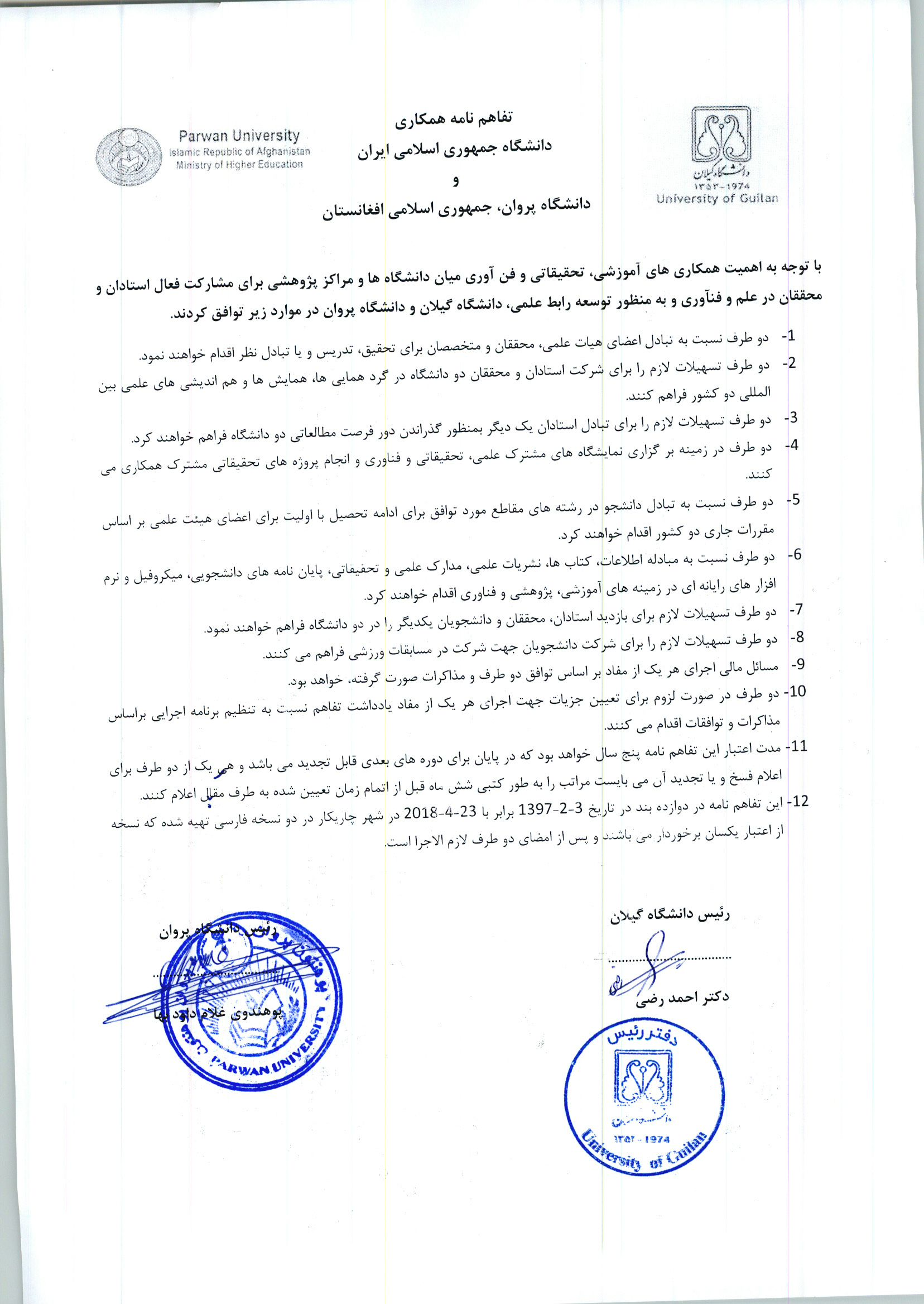 تفاهم نامه میان دانشگاه گیلان و دانشگاه پروان افغانستان